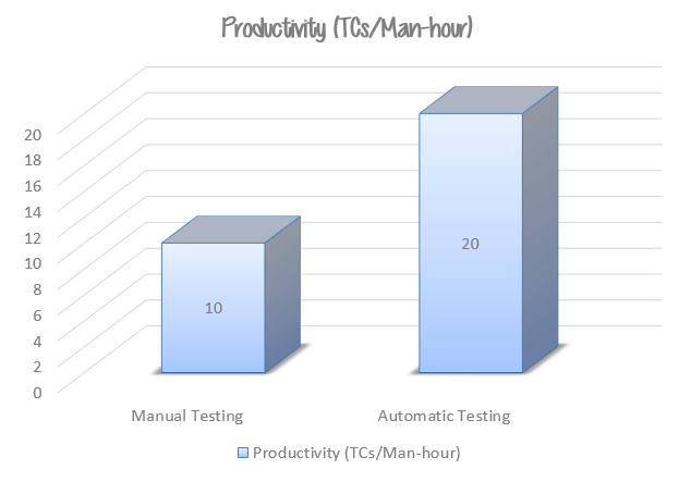 For example, before applying the automated testing to the project, the productivity of testing is 10TCs/man-hour. After applying the automated testing, the productivity is measured to be 20TC/man-hour.