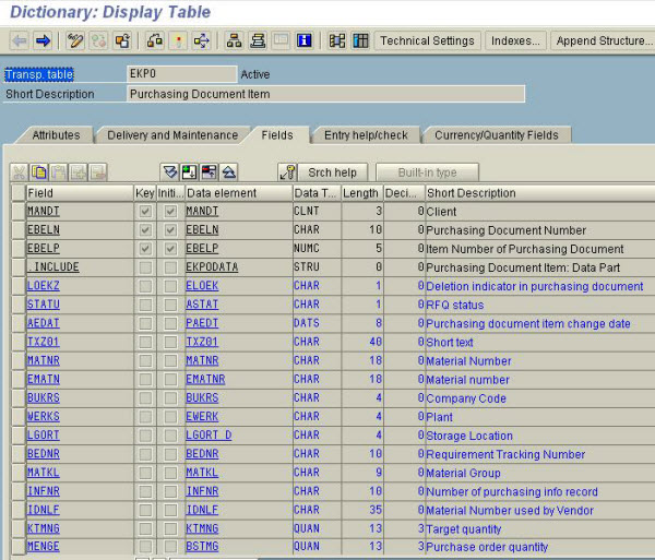 The fields of the table are defined with their (database-independent) SAP ABAP data types and lengths.