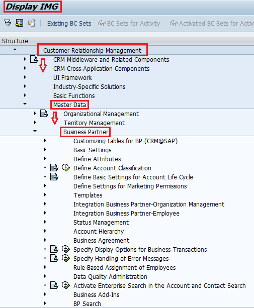 Below is the SPRO path for Business partner customizing. The Partner Processing implemented for a particular business transaction also depends upon the customizing settings implemented for the business partners. Thus the customizing settings for the business partners in CRM are implemented in the SPRO and once done, CRM Web UI is used to create and maintain the business partners