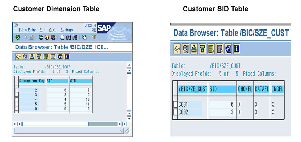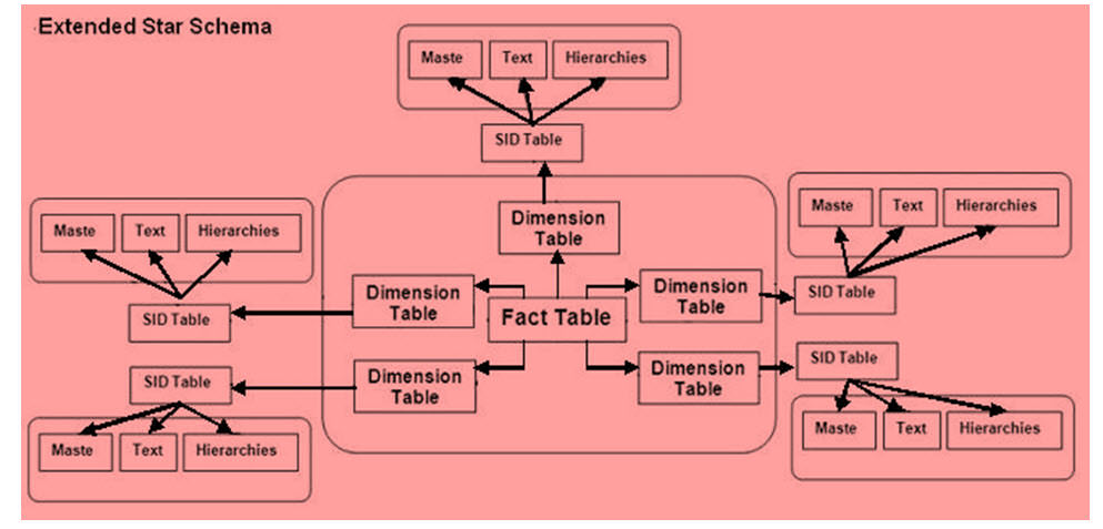 In extended star schema, “fact table” and “master data table” is connected through SID (Surrogate ID) table. In extended star schema , fact table and dimension table will be inside the cube. It has analyzing capacity of 16*248 (SID Table). Fact table is small and dimension table is huge contrary to Star Schema model. Under the extended star schema model, the dimension table do not contain master data