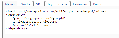 <dependency> <groupId>org.apache.poi</groupId> <artifactId>poi</artifactId> <version>4.1.1</version> </dependency>
