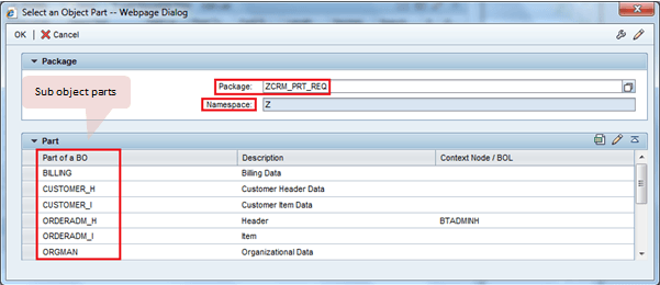 In order to enhance a view after clicking on the "New" button (shown in above scrrenshot) you need to select the business object part where the new field or new table needs to be added:
