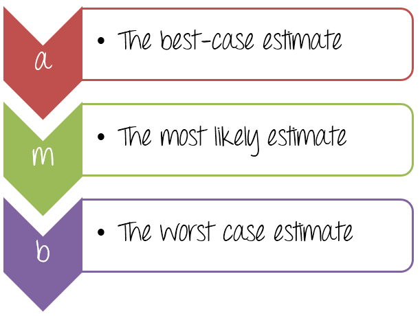 When estimating a task, the Test Manager needs to provide three values, as specified above. The three values identified, estimate what happens in an optimal state, what is the most likely, or what we think it would be the worst case scenario.