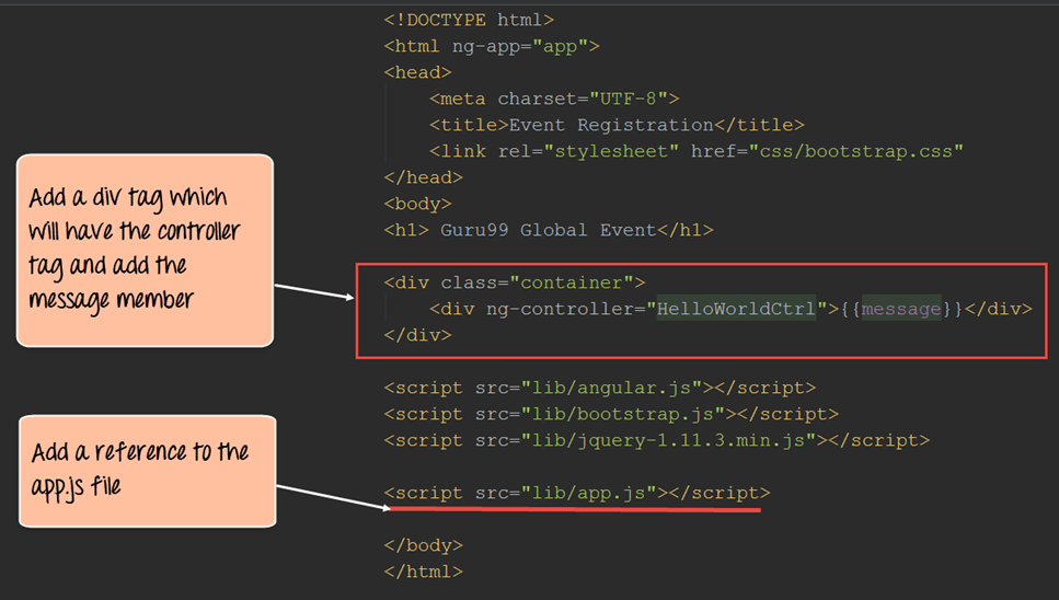 Step 2) Now, in your Sample.html file add a div class which will contain the ng-controller directive and then add a reference to the member variable "message"