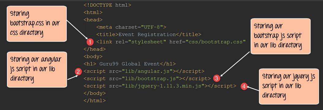 The below code snippet is a simple HTML page which has a title of "Event Registration" and has references to important libraries such as Bootstrap, jquery and Angular.