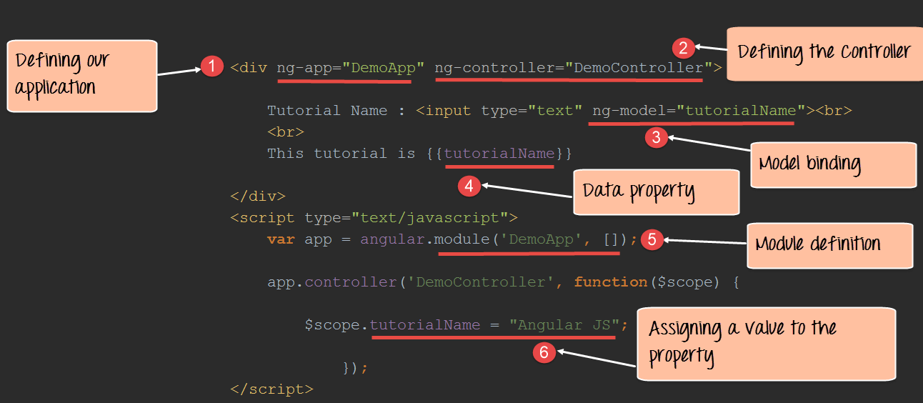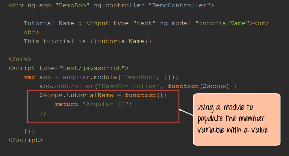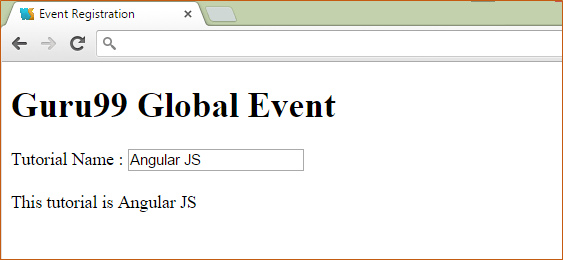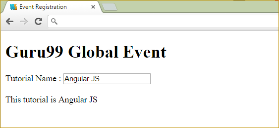 Since we assigned the variable tutorialName a value of "Angular JS", this gets displayed in the text box and in the plain text line.