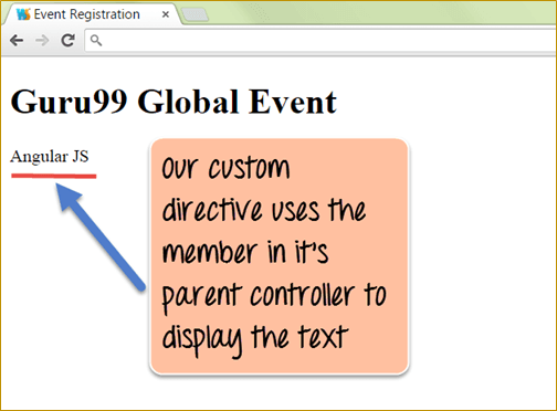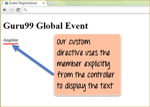 The output clearly shows that the custom directive is especially accessing the DemoController and the member variable tutorialName attached to it and displays the text "Angular".