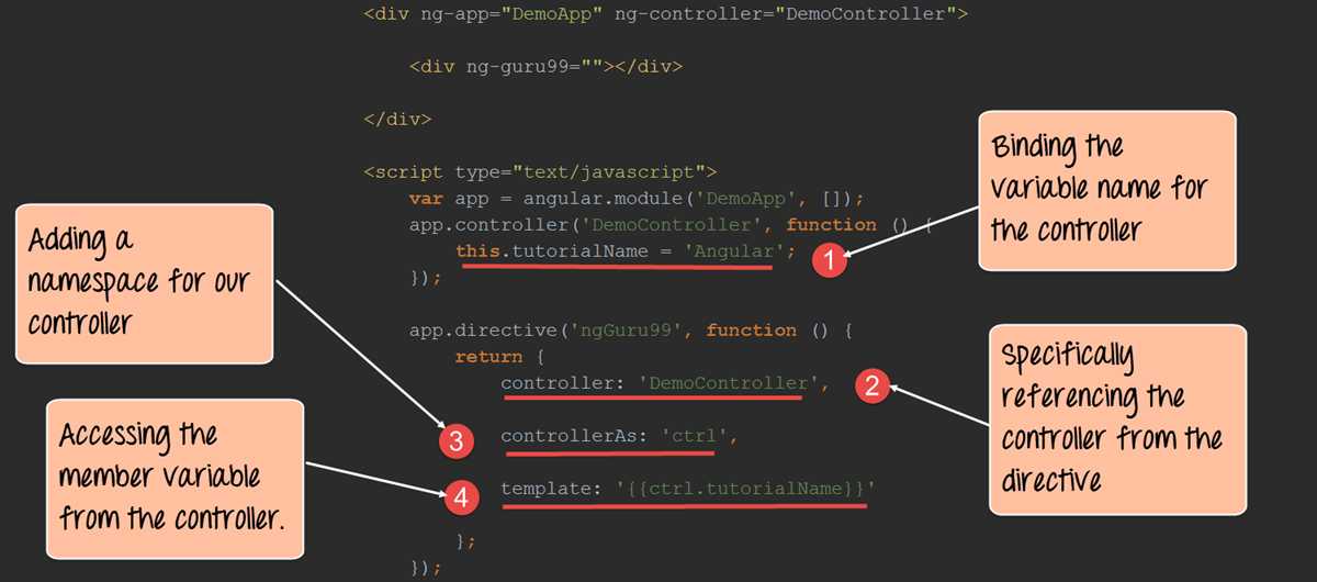 Note: -It is possible to access multiple controllers in a directive by specifying respective blocks of the controller, controllerAs and template statements.