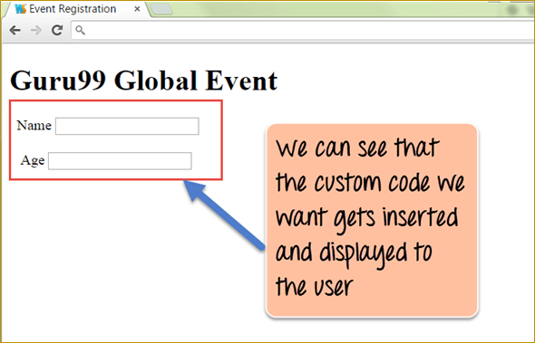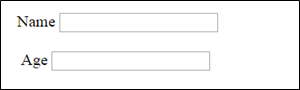 Instead of a plan five tag or text, we are actually entering the entire fragment of 2 input controls for the "Name" and "age" which needs to be shown on our page.