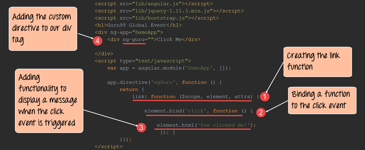 Events such mouse clicks or button clicks can be handled from within directives itself. This is done using the link function. The link function is what allows the directive to attach itself to the DOM elements in an HTML page.