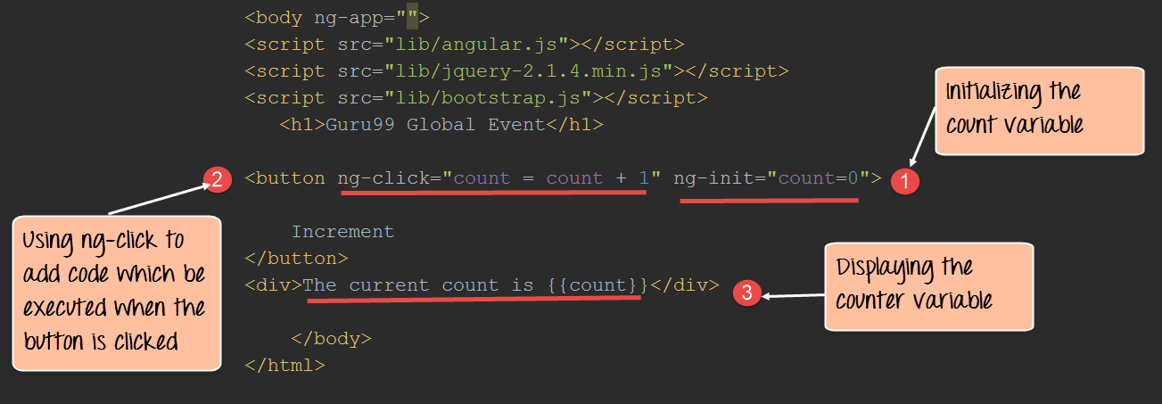 For example, if there is a button on the page and you want to process something when the button is clicked, we can use the ng-click event directive.