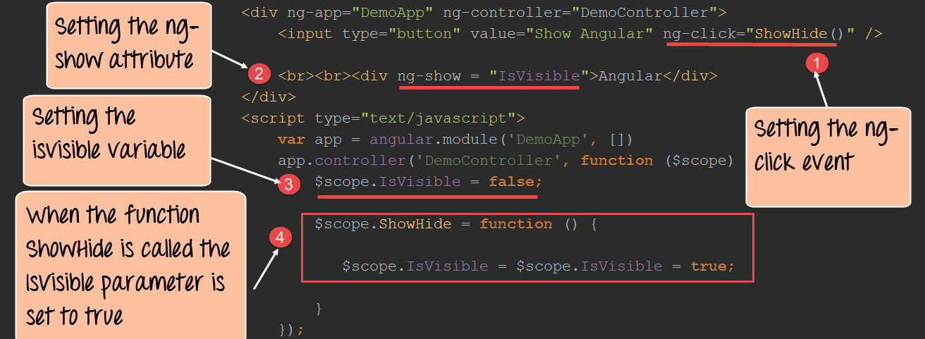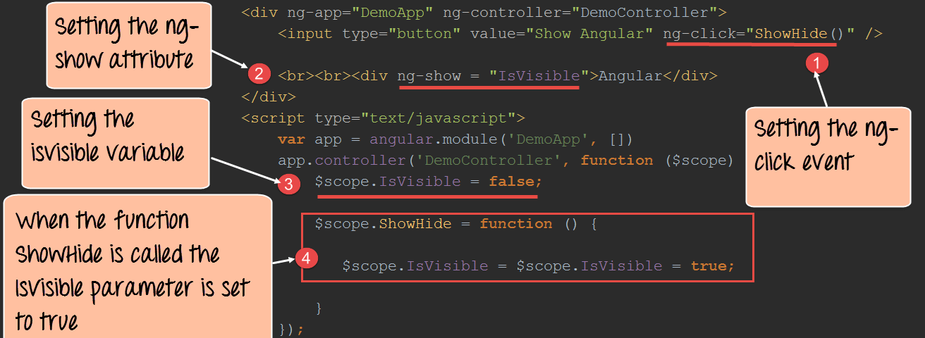 In the controller, we are attaching the "IsVisible" member variable to the scope object. This attribute will be passed to the ng-show angular attribute (step#2) to control the visibility of the div control. We are initially setting this to false so that when the page is first displayed the div tag will be hidden.
