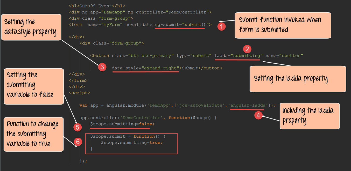 When the submit button is pressed, the submitting variable in the controller is set to true. This value gets passed to the "ladda" attribute of the submit button which causes the spin effect of the button.