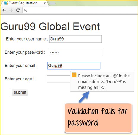Let's then enter wrong email id and click the submit button. After the submit button is clicked, a pop-up will appear showing a validation error that the field needs to have the @ symbol.
