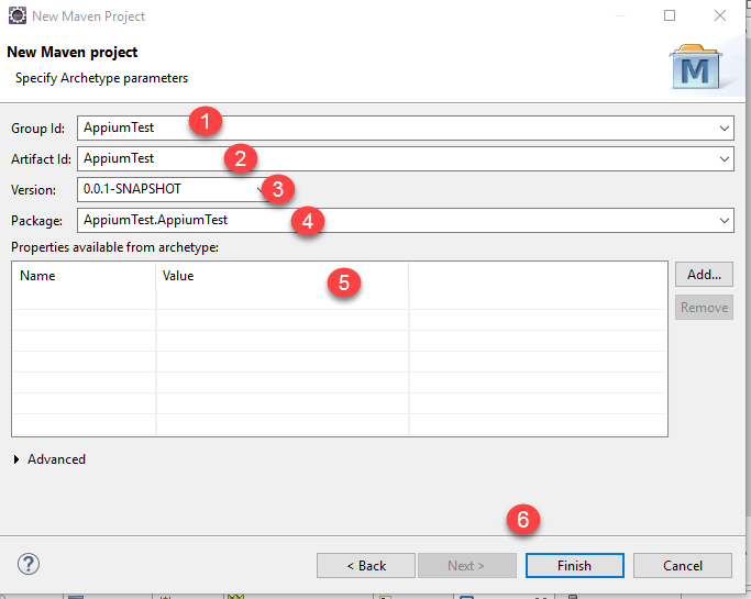 Step 2) Then in 'New Maven Project' window, enter 'Appium Test' in Group Id and Artifact Id column. In this step, you have to enter.