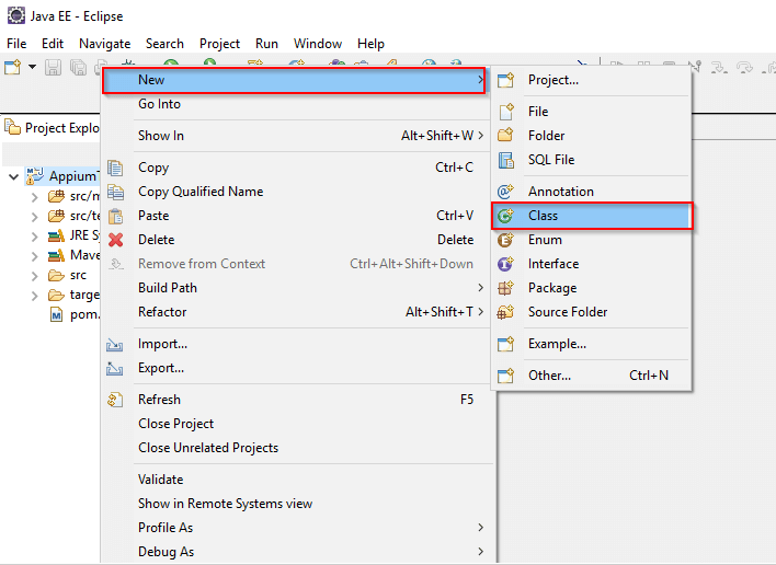 Step 3) To start with Appium script. Right click on 'src/main/java' from left side explorer window. Then select New >> class. Write the Appium code inside the selected class.