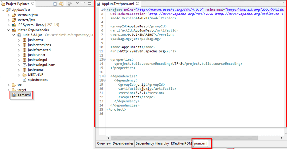 Step 4) In the same project, click over pom.xml from left explorer menu. All dependencies will be visible by default in 'pom.xml' tab. Refer to the Image below-