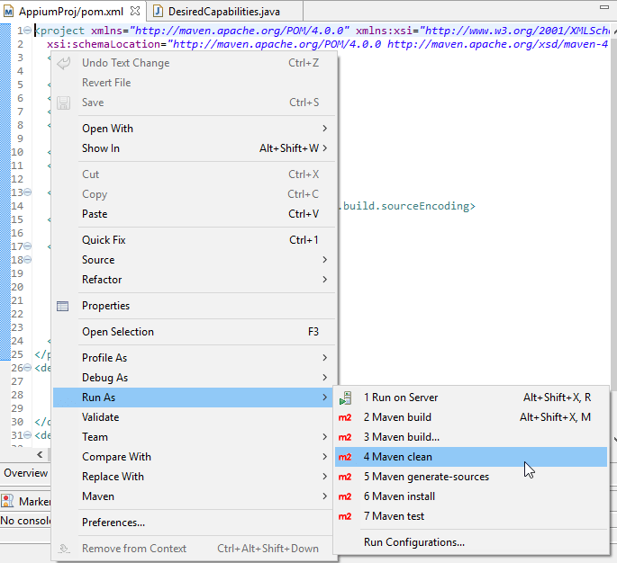 Step 5) Now, right click on 'pom.xml' from left explorer or over the xml code for 'AppiumTest' project. Then click 'Run As >> Maven Clean' option.