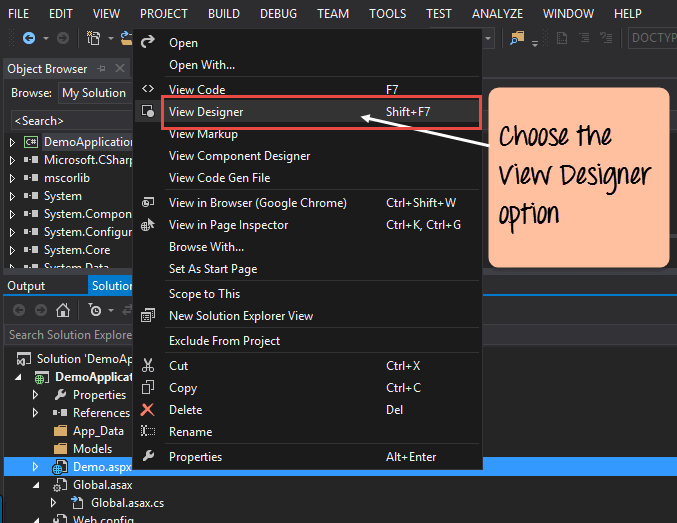 Step 1) The first step is to open the Forms Designer for the Demo web form. Once you do this, you will be able to drag controls from the toolbox to the Web form.