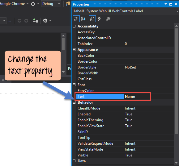 Step 3) From the properties window, change the name of the Text property to Name
