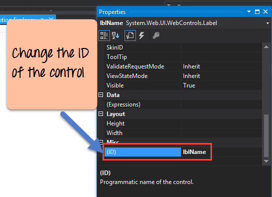 Similarly, also change the ID property value of the control to lblName. By specifying a meaningful ID to controls, it becomes easier to access them during the coding phase. This is shown below.