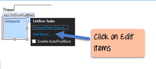 Step 2) Once you drag the listbox to the form, a separate side menu will appear. In this menu choose the 'Edit Items' menu.