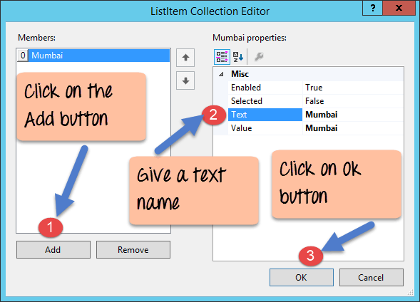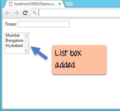 A Listbox is used to showcase a list of items on the Web form. Let's see how we can implement this with an example shown below. We will add a list box to the form to store some city locations.