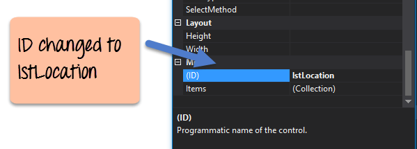 Step 4) Go to the properties window and change the ID property value of the control to lstLocation.
