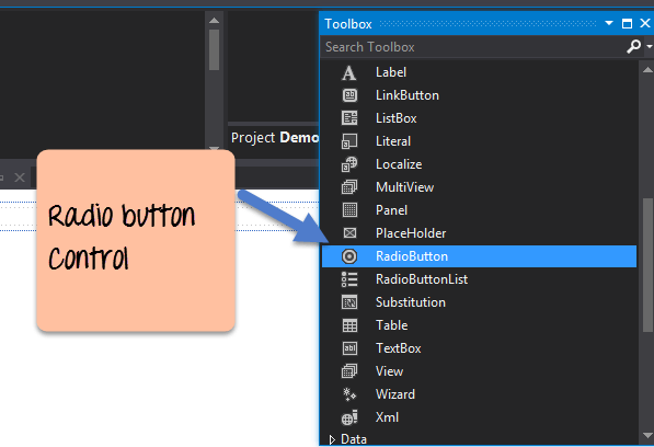 Step 1) The first step is to drag the 'radiobutton' control onto the Web Form from the toolbox. ( see image below). Make sure to add 2 radio buttons, one for the option of 'Male' and the other for 'Female.'
