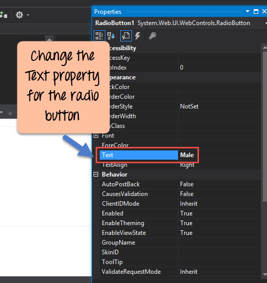 Step 2) Once the Radiobutton has been added, change the 'text' property.