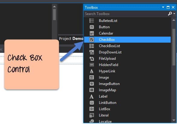 Step 1) The first step is to drag the checkbox control onto the Web Form from the toolbox as shown below