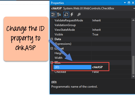 Step 2) Once the Checkboxes have been added, change the checkbox id property to 'chkASP'.