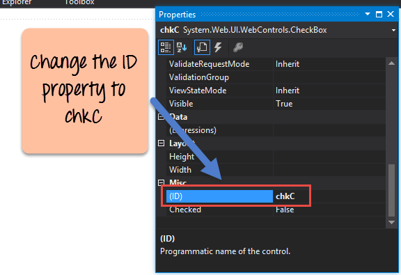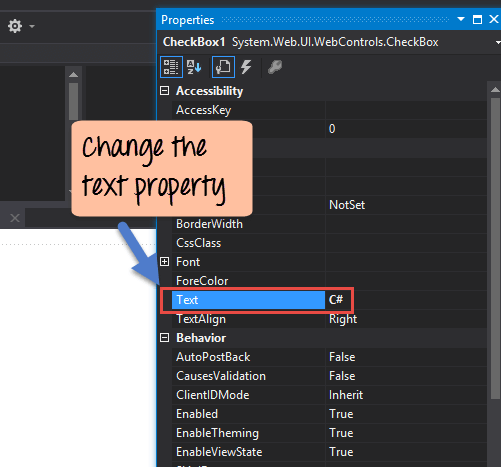 Also, change the text property of the Checkbox control to 'C#'. Do the same for the other Checkbox control and change it to 'ASP.Net'.