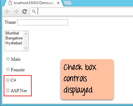 A checkbox is used to provide a list of options in which the user can choose multiple choices. Let's see how we can implement this with an example shown below. We will add 2 checkboxes to our Web forms. These checkboxes will provide an option to the user on whether they want to learn C# or ASP.Net.