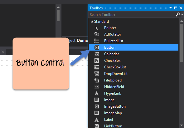 Step 1) The first step is to drag the button control onto the Web Form from the toolbox as shown below