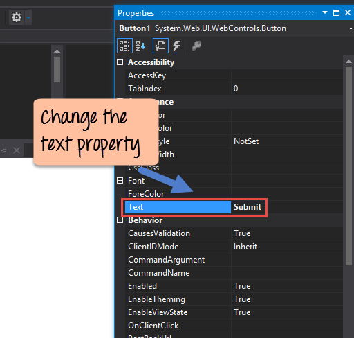 Step 2) Once the button has been added, go to the properties window by clicking on the button control. Change the text property of the button control to Submit. Also, change the ID property of the button to 'btnSubmit'.