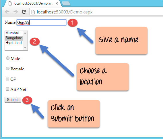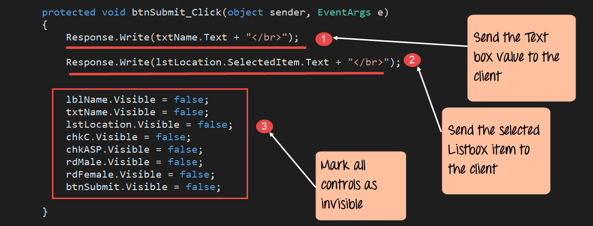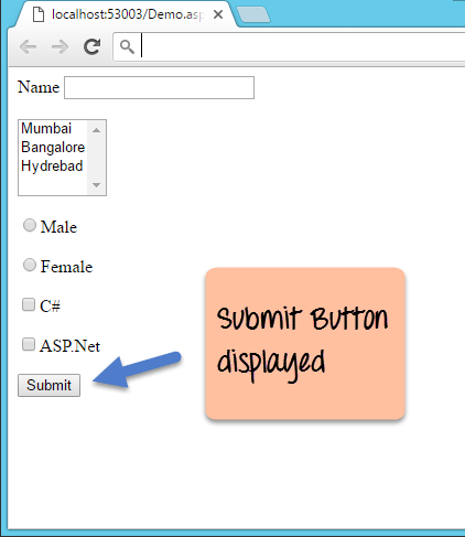 Normally, when a person enters all the information on the form such as the Name, location, Gender, etc. The next page shown to the user should only have the information which was not entered. The user does not want to see the Name, Gender, location controls again. But ASP.Net does not know this, and hence, by default, it will again show all the controls when the user clicks the Submit button. Hence, we need to write code to ensure all the controls are hidden so that the user just sees the desired output.