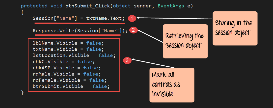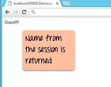 In our example, we are going to use the Session object to store the name entered in the name textbox field in the page. We are then going to retrieve that value and display it on the page accordingly. Let's add the below code to the Demo.aspx.cs file.