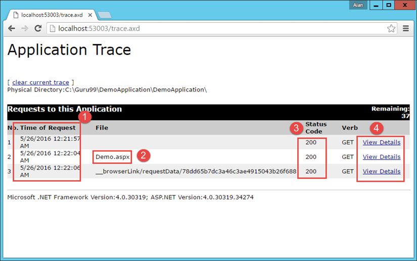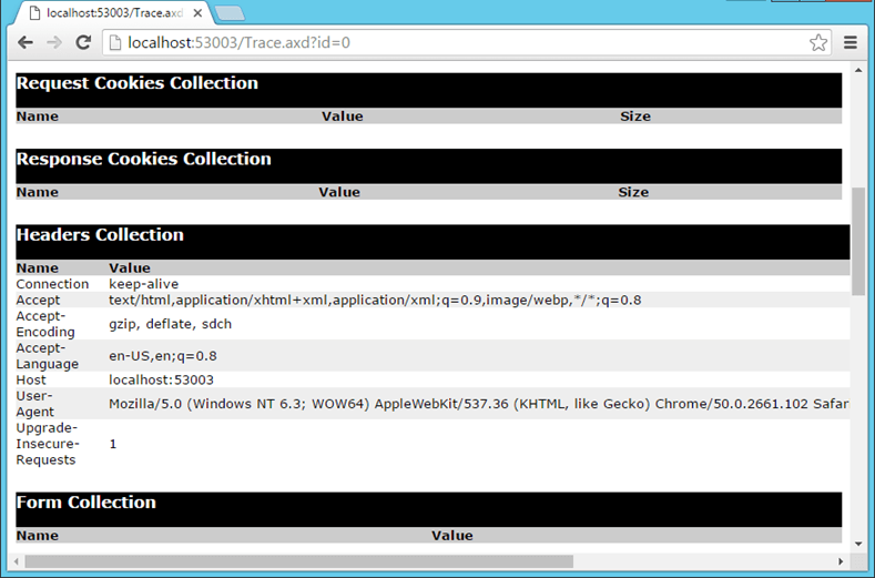If you now browse to the URL – http://localhost:53003/trace.axd , you will see the information for each request. Here you can see if any errors occur in an application. The following types of information are shown on the above page