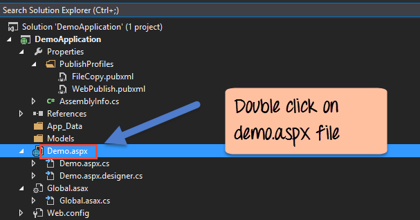 Step 1) Let's work on our DemoApplication. Open the demo.aspx file from the Solution Explorer