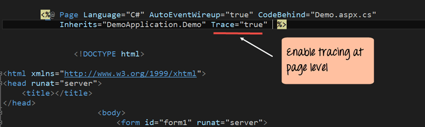 Step 2) Add the below line of code to enable page tracing. In the Page declaration, just append the line Trace="true". This code line will allow page level tracing.