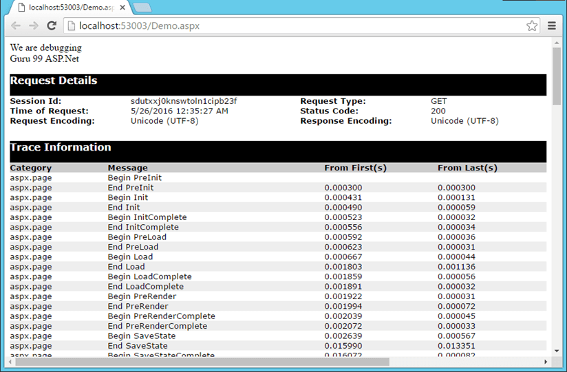 Now when the web page Demo.aspx is displayed, you will get a whole lot of information about the page. Information such as the time for each aspect of the page lifecycle is displayed on this page.
