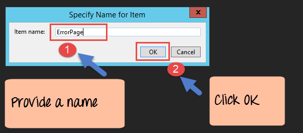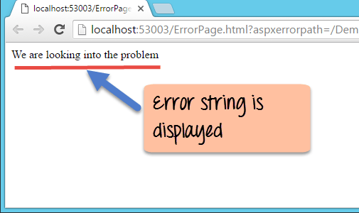 In our example, we are first going to add an HTML page. This page will display a string to the user "We are looking into the problem". We will then add some error code to our demo.aspx page so that the error page is shown.