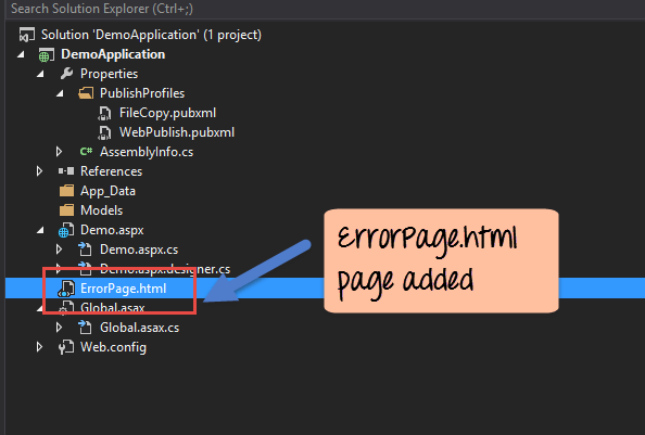 Step 3) The Errorpage will automatically open in Visual Studio. If you go to the Solution Explorer, you will see the file added.