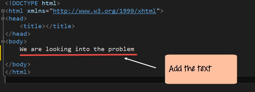 Add the code line "We are looking into the problem" to the HTML page. You don't need to close the HTML file before making the change to the web.config file.