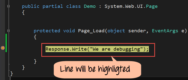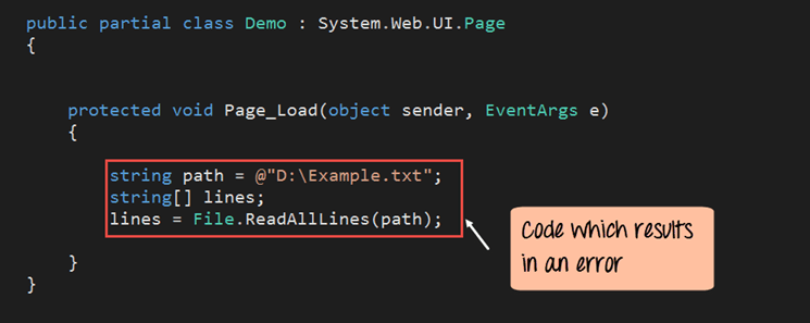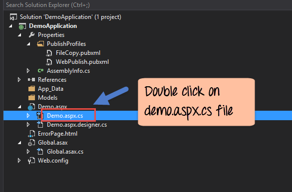 Step 5) Now let's add some faulty code to the demo.aspx.cs page. Open this page bydouble-clickingg the file in Solution Explorer