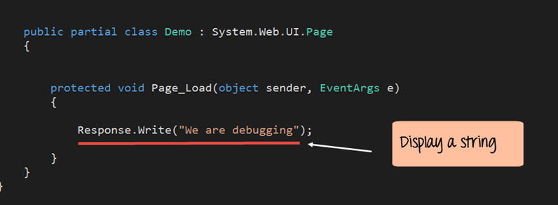 Let's take an example of a program. The program displays a string "We are debugging" to the user. Suppose when we run the application, for some reason, the string is not displayed. To identify the problem we need to add a breakpoint. We can add a breakpoint to the code line which displays the string. This breakpoint will pause the execution of the program. At this point, the programmer can see what is possibly going wrong. The programmer rectifies the program accordingly.