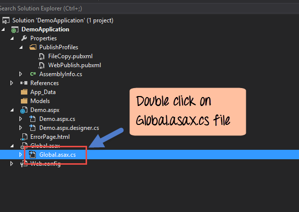 Step 1) Let's work on our DemoApplication. Open the Global.asax.cs file from the Solution Explorer