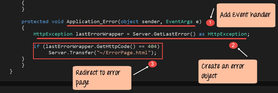 Step 2) Add the below line of code to the global.asax.cs. These lines will be used to check for errors and display the ErrorPage.html page accordingly.