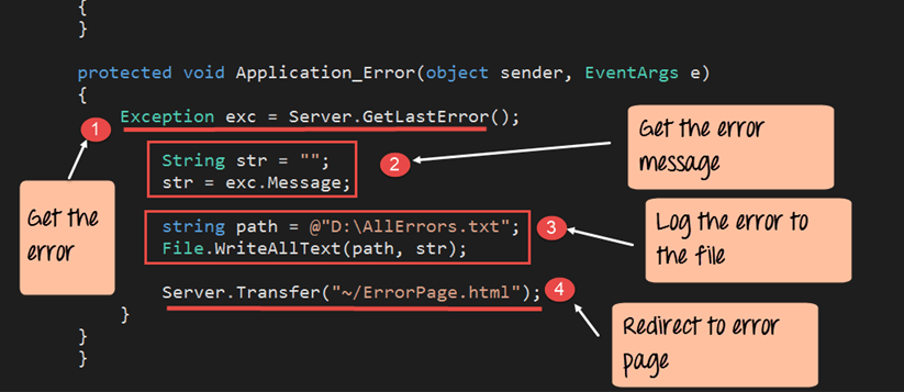 Step 2) Add the below line of code to the global.asax.cs. It will check for errors and display the ErrorPage.html page accordingly. Also at the same time, we will log the error details in a file called 'AllErrors.txt.' For our example, we will write code to have this file created on the D drive.